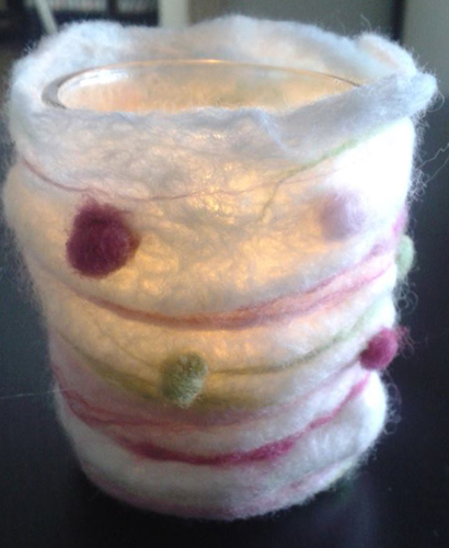 Ein mittelgroßes Windlicht - nass gefilzt mit Innenglas in Weiß,