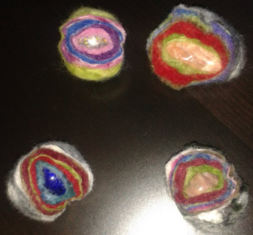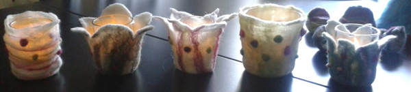 und handgearbeitet sind. Werkstücke aus Filz, Holz, Gläsern, Wolle
